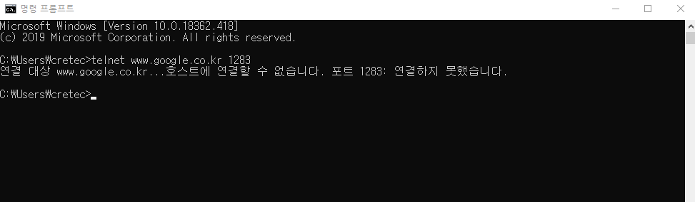 해당 포트번호가 막혀있다면 아래와 같이 연결하지 못했다는 메시지가 출력될 것이다.